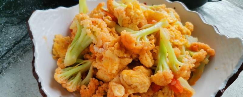 4、锅中热油,倒入花菜大火爆炒,再倒入鸡蛋。
