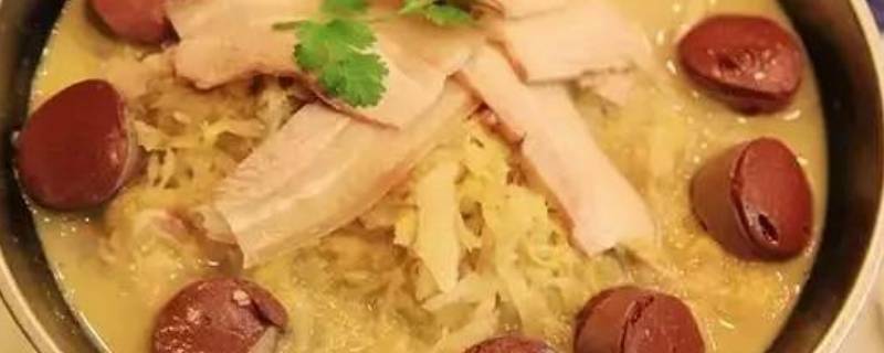1、酸菜血肠:把处理好的血肠和酸菜下到汤中,使血肠被酸菜吸收,只剩下香软的口感,被散发着特有香味的酸菜丝夹着出锅。