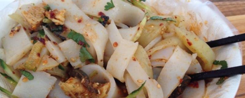 1、景泰酿皮:将面粉用凉水和成硬团,在清水中揉搓,使面粉中的蛋白质和淀粉分离。倒去清水放食碱,调成面浆,舀入平底盘蒸熟成片,凉后切成粗细长条即可。加上油泼辣椒、精盐、酱油、蒜泥、芥末、香醋、芝麻酱等调料,再加一小撮青菜即可食用。