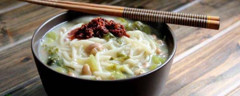 2、浆面条:浆面条的做法很简单,用做凉粉去了粉皮下的水当老汤在锅里熬,汤烧开后将面条下到锅里,煮熟捞出,放到碗里加入水煮花生、黄豆、凉调芹菜、芝麻炒焦后轧成的的碎末、香油等配料即可。这样做出的浆面条面色很白,白中有青,青中有红,红中有黄,味道酸中有香,香中有脆。