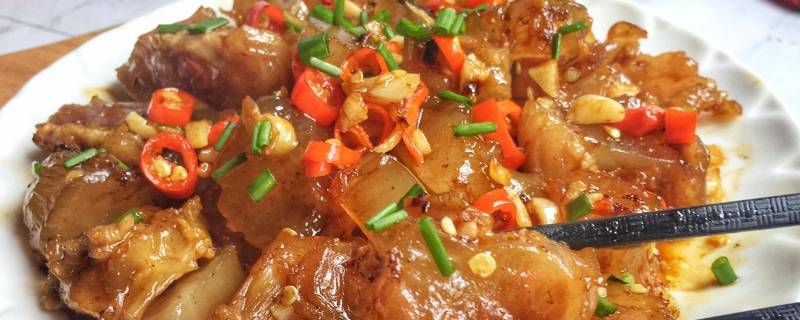 4、放入焯好的蹄筋,烹入料酒翻炒均匀。