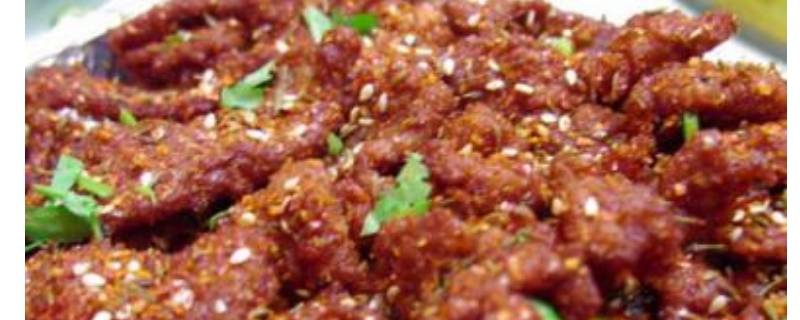 4、撒入辣椒段、孜然、辣椒面和盐。
