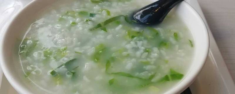 3、待锅内大米熬成粘稠的米粥,先放入火腿肠熬两分钟,再放入青菜熬一分钟,最后加入盐和鸡精即可。