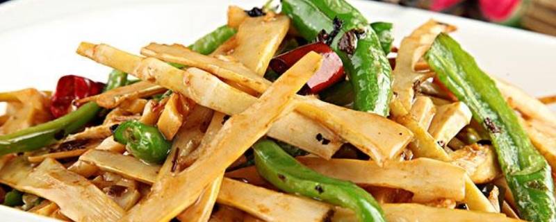 1、准备食材:竹笋300克、猪肉180克、食盐1茶匙、香油2滴、生抽1茶匙、淀粉2茶匙、料酒1茶匙、植物油1汤匙、干辣椒4个、鸡精1茶匙。