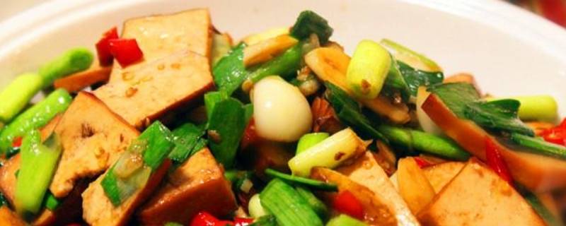 二、上海青炒豆腐干。1、准备食材:上海青适量、豆腐干适量、青红辣椒2个、植物油适量、盐适量、生抽5克、姜2克、鸡精1克。