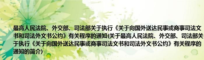 1、 最高人民法院、外交部、司法部关于执行《关于向国外送达民事或商事司法文书和司法外文书公约》有关程序的通知在1992.03.04由最高人民法院, 外交部, 司法部颁布。