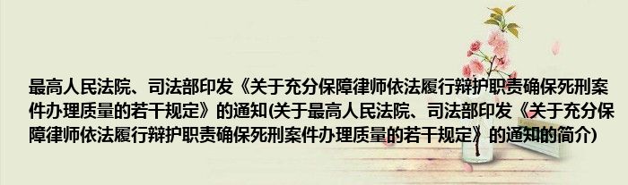 本文关于最高人民法院、司法部印发《关于充分保障律师依法履行辩护职责确保死刑案件办理质量的若干规定》的通知的简介就讲解完毕,希望对大家有所帮助。