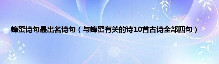 大家好,小常来为大家解答以上问题。蜂蜜诗句最出名诗句,与蜂蜜有关的诗10首古诗全部四句很多人还不知道,现在让我们一起来看看吧!