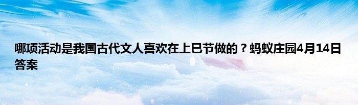 下列哪项活动,是我国古代文人喜欢在上巳节做的?蚂蚁庄园4月14日的问题正式发布,如果回答正确就可以领取奖励,可能很多的玩家还不太清晰具体的答案是什么,为了让大家都能领取到小鸡饲料,下面就是蚂蚁庄园小课堂4月14日的答案和答案解析。