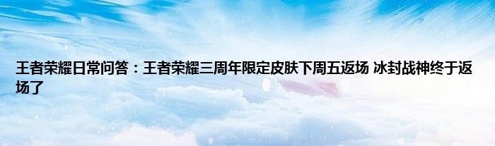 今天来聊聊关于王者荣耀日常问答:王者荣耀三周年限定皮肤下周五返场,冰封战神终于返场了的文章,游戏是很多人的选择,但是游戏玩多了也会身心疲惫,现在就为大家来简单介绍下王者荣耀日常问答:王者荣耀三周年限定皮肤下周五返场,冰封战神终于返场了,希望对各位小伙伴们有所帮助。