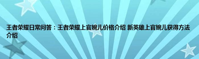 小编今天给各位玩家朋友们带来的是王者荣耀日常问答:王者荣耀上官婉儿价格介绍,新英雄上官婉儿获得方法介绍,有记得的玩家朋友吗?不记得也没有关系,小编已经帮助大家把王者荣耀日常问答:王者荣耀上官婉儿价格介绍,新英雄上官婉儿获得方法介绍找了出来,你只需要动动你的小手就可以轻松知道啦,快来瞧一瞧吧。