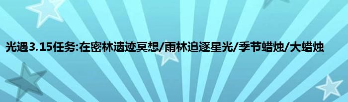 光遇3月15日任务攻略汇总分享,今天的每日任务分别是传递能量、掀翻螃蟹、以及在雨林追逐星光、在密林遗迹冥想。其中后两个相对会有些难度,还有今天的季节蜡烛和大蜡烛在哪里呢?这里就为大家带来光遇3.15任务攻略大全。