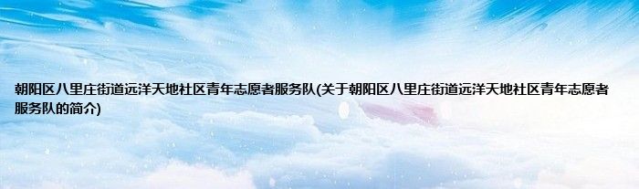 1、 朝阳区八里庄街道远洋天地社区青年志愿者服务队是由朝阳区八里庄街道青年志愿者服务队领导下的志愿团体。