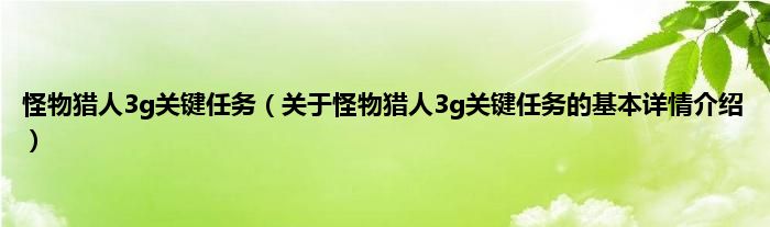 本文关于怪物猎人3g关键任务的基本详情介绍就讲解完毕,希望对大家有所帮助。